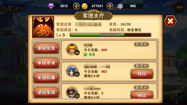 军团大厅是展示军团各项信息的地方,在这里可以查看到军团成员、成员职位、军团等级等方面的信息。同时也能够在该位置选择退出军团,在退出军团的24小时内将无法加入新的军团。