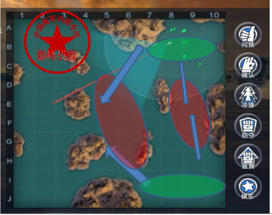 这幅图据点和死斗打法基本一致。椭圆形绿色区域为双方出生点,地图中心圆形红色区域为据点,红色椭圆形区域代表交火区域,粗蓝色箭头代表双方大部队最佳前进方向,细蓝色箭头代表少量船只前进方向(细箭头区域,当初和哈特、罗兰、亮剑几个驱逐去过,好长时间看不见人,顿时觉得我们几个玩的不是战舰,是赛艇)。