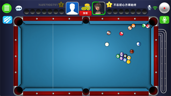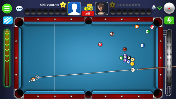 请注意,围绕头像边框的进度条显示了玩家当前所剩时间,时间倒计时结束后,将轮到对方出手;当白球或黑8进袋,则可以摆放任意球;拖动右侧的调节按钮,可以针对击球的角度进行微调。