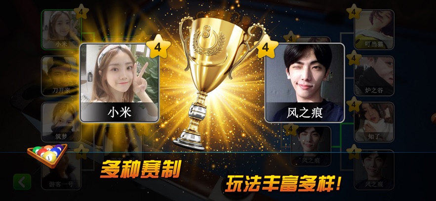 1、使用标准的8球规则或9球规则对抗计算机AI/玩家。