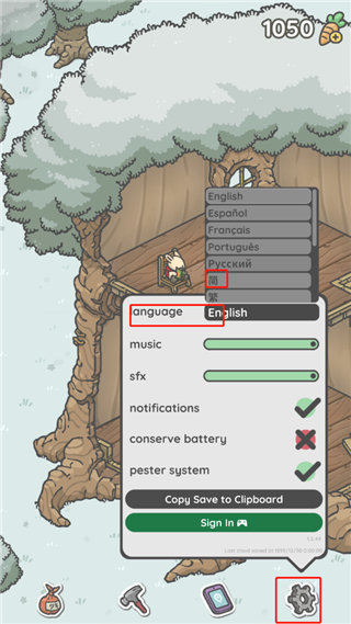 经过新手教程后,我们进入游戏首页,点击设置齿轮键,选择language,选择简即可设置成中文。