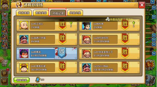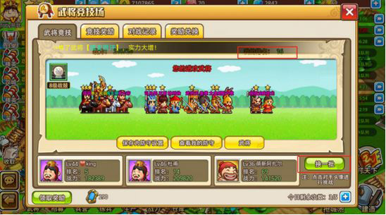武将竞技场每天晚上21:00结算,按照竞技排名发放奖励。挑战获胜,提升最高排名可获得一次性金币奖励。竞技场只能使用武将进行战斗,兵种无法上阵。点击下方头像选择战斗对象,如没有满意的可以点击右侧的换一批按钮。右上角会显示目前的排名。若战斗胜利,且防守方的排名高于进攻方,则双方排名对调。如攻打排名比自己低的玩家则只会获得金币奖励。