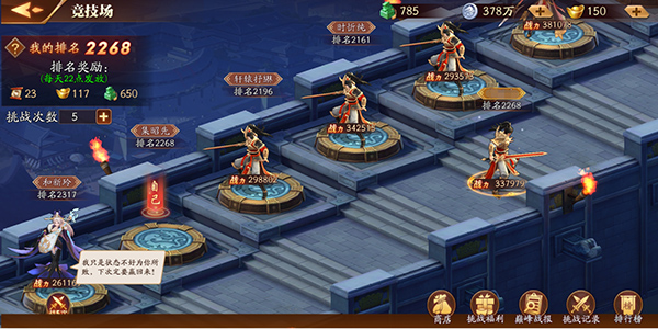 在竞技场中可以看到与自己排名相仿的敌人,挑战成功后,如果战胜排名靠前的玩家,则与该玩家互换位置,并且还有丰厚奖励。每天会有5次免费挑战次数。