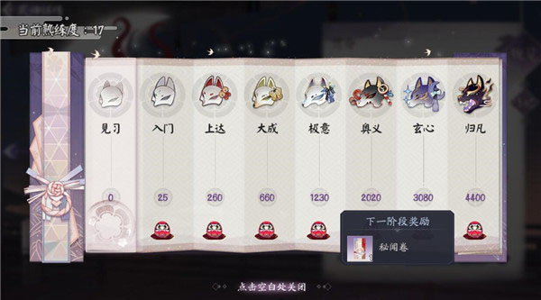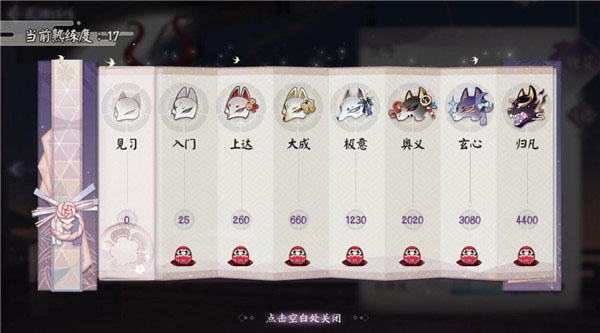 当式神熟练度提升到后三个阶段,“极意,奥义、和玄心”时,会依次获得100、120、140御札的奖励。
