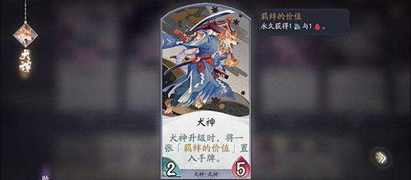 套牌的核心式神,他每次升级都可以获得一张羁绊的价值,可以同时提升1点攻击和血量。注意这里的提升是永久性的,即使犬神气绝之后复活,卡牌的加成也依然存在。