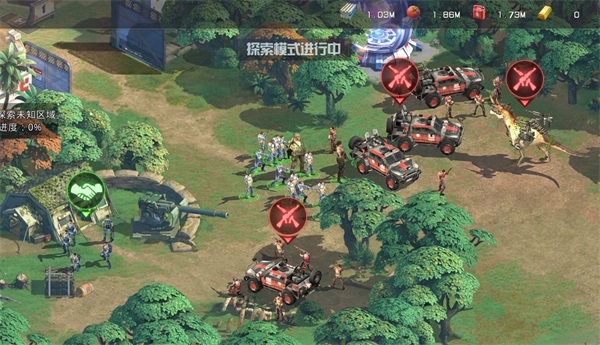 探索的时候可能会遇到NPC势力的军队或者其他野生巨兽,只要击败它们就能把这块区域划分到自己的基地范围内,在上面建造各种设施。