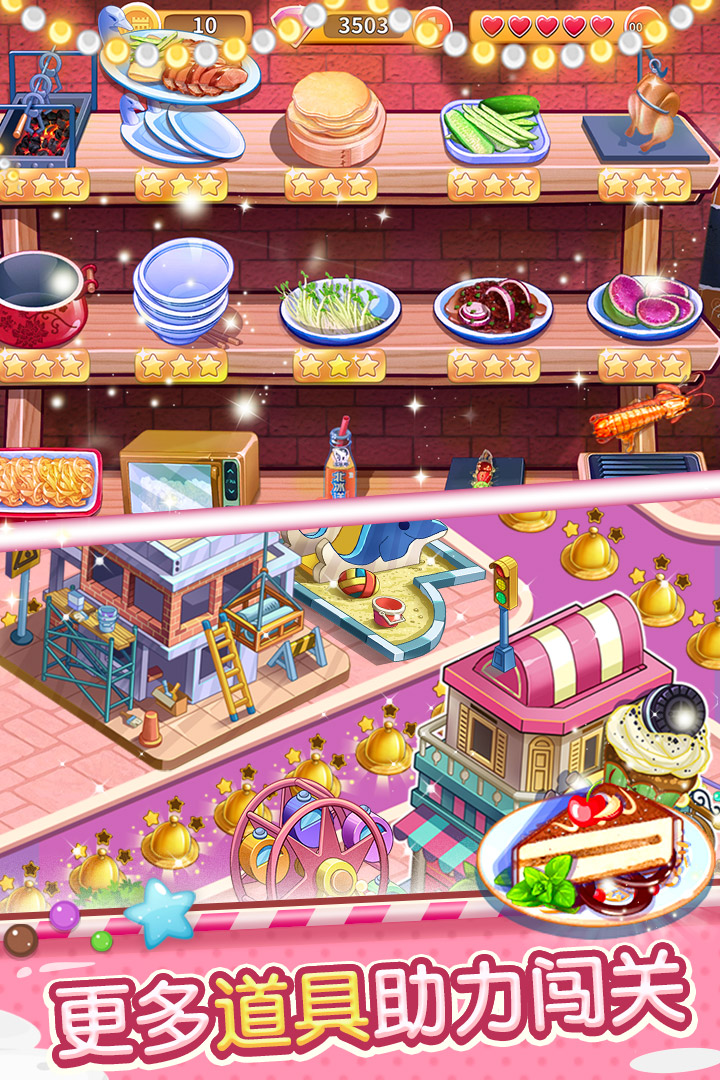 2、用独特的烹饪技能和特色菜谱,直达成功巅峰,沿途赢取金币和金卡解锁新餐馆;