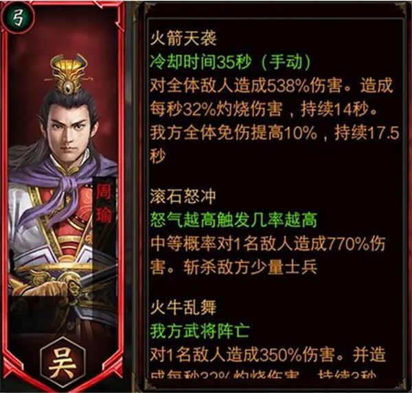 最后一个是周瑜,周瑜是一个群伤害最高的可以对敌方全体伤害538%还有每秒32%灼烧伤害持续14秒,还可以提高全有军提高10%免伤持续17.5秒就这样的群伤不用周瑜还可以用谁,再说还和小乔有缘分武将附加的伤害。