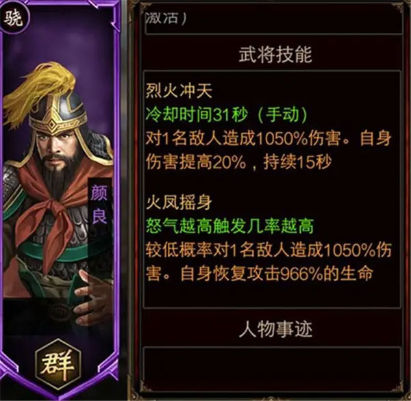 第二个武将小编推举颜良,别小看在剧情任务中送给大家颜良,颜良虽说是紫色武将可是伤害是相当的高啊,技能可以对敌人伤害1050%自身还可以提高伤害20%这是多么好的伤害,还可以恢复攻击的966%生命,所以小编为大家推举颜良经济实惠很适合大家试用。