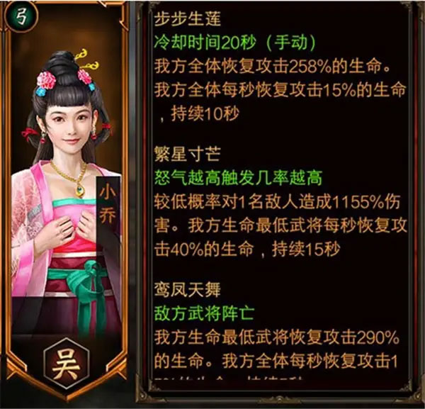 第三个武将是小乔(个人喜欢小乔大家也可以换成刘备或者荀彧还有华佗都是可以的各有各的好处可是小编是喜欢小乔的在这里就不多说了,你们懂得美女吗。)小乔技能给我放全体恢复攻击258%生命还让我方全体在10秒里恢复攻击的15%生命,小乔还可以造成伤害1155%所以小编喜欢小乔大家也可以试用下。