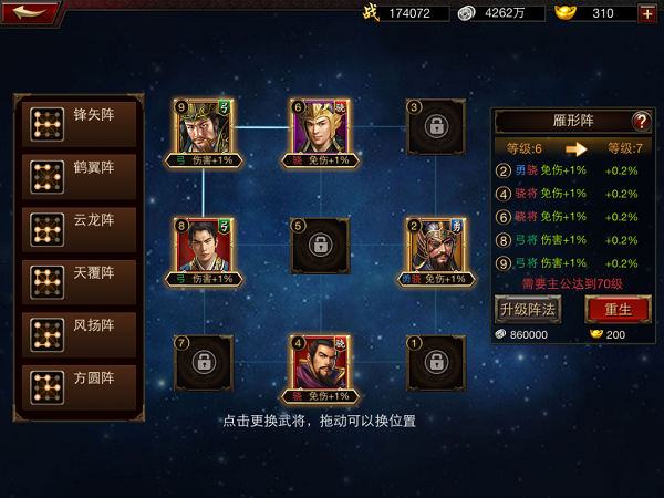 3、武将进阶、修炼终成大器,同时麾下士兵也可提升进阶,护主保国!多余武将无法上阵,只要有缘分即可加为旗下副将,同为主公陷阵杀敌。