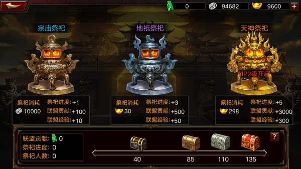 通过联盟祭祀,可以获得联盟经验提升联盟等级,目前的祭祀的方式分为三种:宗庙祭坛、地抵祭坛、天神祭坛,每种祭坛都可以同时获得祭祀进度、联盟经验和联盟贡献。