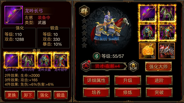 在《三国群英传-争霸》中,只要收集齐4件前缀相同的装备(如:龙吟长弓、龙吟兵符、龙吟头盔、龙吟铠甲),即可获得强力的套装属性,提升武将兵力,攻击力等属性。