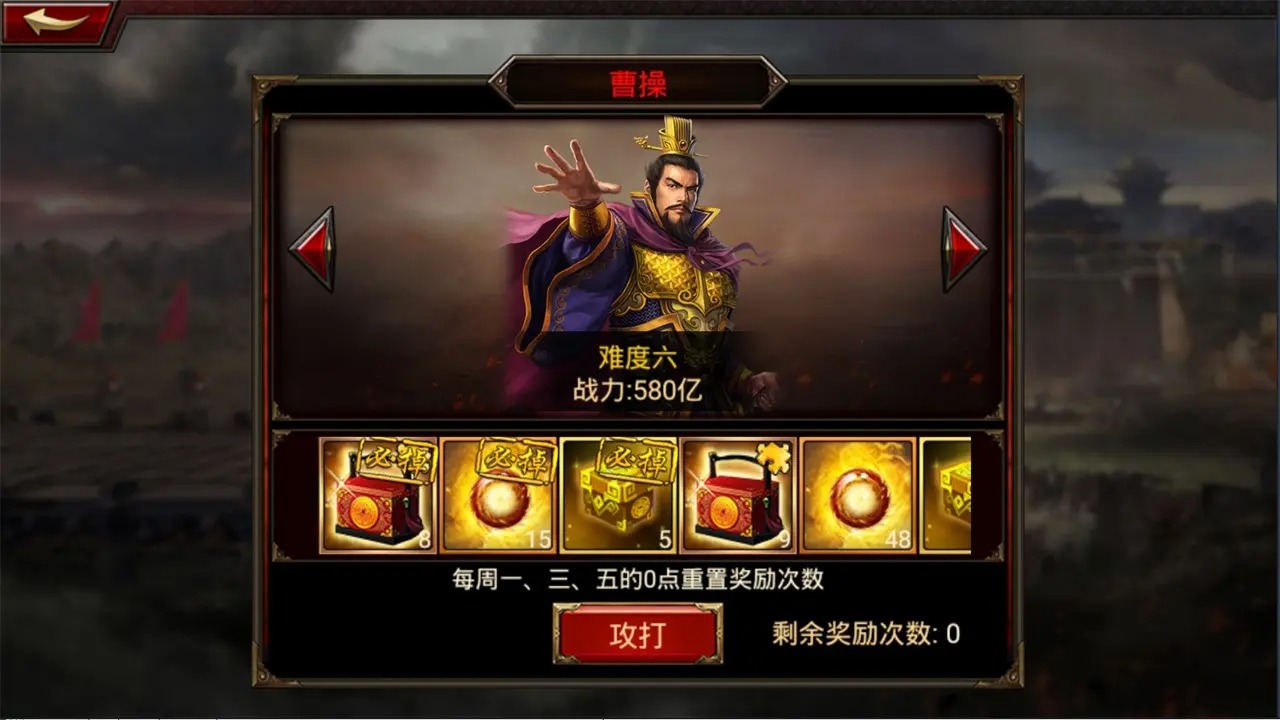 日常任务种类繁多,难度也各不相同,包含完成副本、强化装备、购买道具……每完成一个日常任务,都能获得道具奖励和一定的积分,积分达到一定数量,还能开启相应的宝箱获得元宝、急行军令、橙将碎片箱等珍贵道具哦~