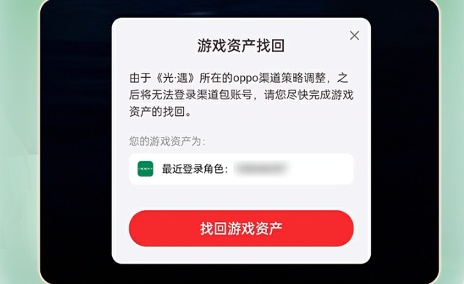 2、登录您待资产找回的OPPO渠道账号,出现游戏内的提示弹窗,请点击【✓】前往进行资产找回