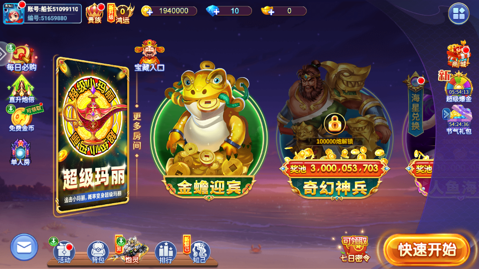 1、下载进入大炮捕鱼游戏,运行游戏,这里有超级玛丽、神赐宝藏、奇幻神兵等多种模式;