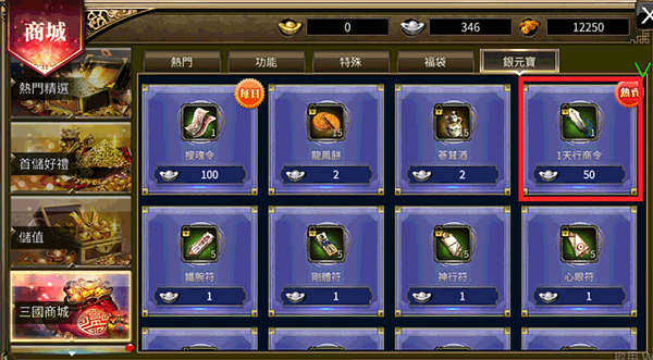 购买【行商令】,就能获得摆摊的资格条件,购买管道可透过银元宝或金元宝购入。