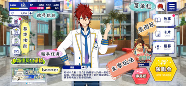 在偶像梦幻祭2游戏中,萌新玩家怎么玩?相信很多玩家都不知道,小编就给大家带来了萌新速成攻略,希望可以帮到大家,为了方便大家查看,主要将界面分为以下几个区域(详情看图)。
