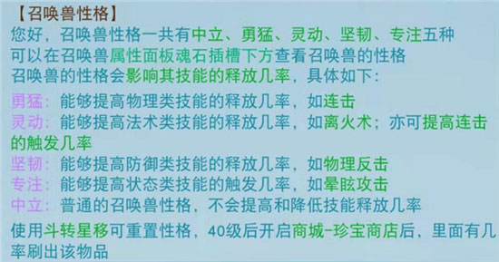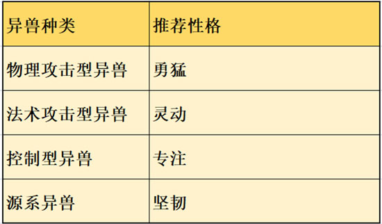 异兽的性格会对其释放技能的几率产生影响。具体效果和推荐搭配参考下面两张图。商城里的“斗转星移”可重置异兽性格。