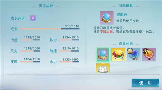 成长资质直接影响到其他资质和属性点的收益。所以要先从商城或势力库房中获得聚能丹,将成长资质拉满,然后再用资质丹和资质丹。极培养其他资质。