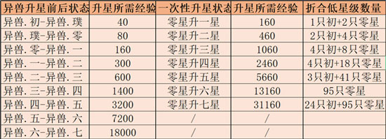 下表是异兽升星的详细消耗。