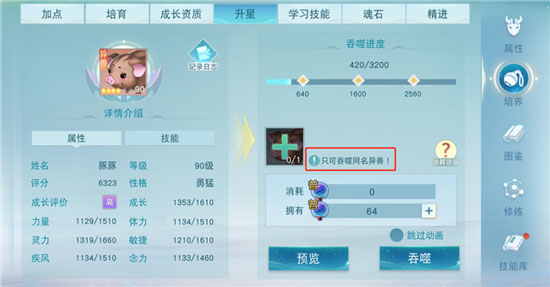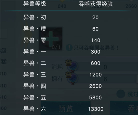 异兽吞噬同名异兽后可升星,提升属性和专属技能效果,吞噬需要消耗资质丹。