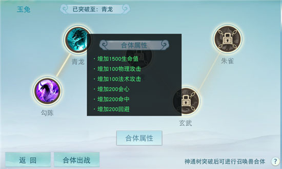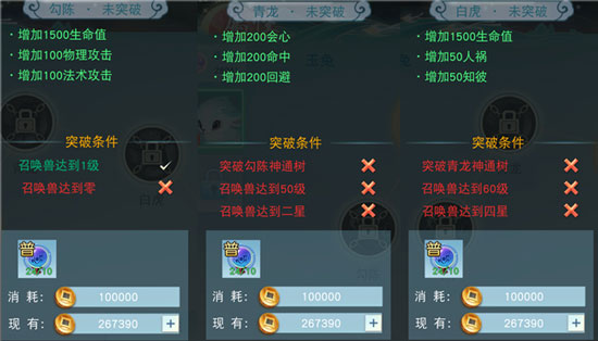 神通树共分为勾陈、青龙、白虎、玄武、朱雀五个等级。当玉兔的等级和星级达到要求后,消耗少量的资质丹和金币就能突破。