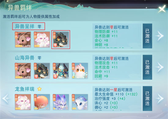 不同的异兽可产生不同的羁绊效果。随着整体异兽的星级提升,羁绊的效果也会逐步增加具体的羁绊效果,根据羁绊中星级最低的召唤兽来决定。比如图中【龙鱼祥瑞】羁绊,星级最低的是一星应龙,羁绊效果就是一级。