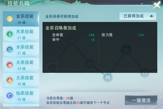 技能共鸣系统将所有技能分为七种属性:金木水火土仙魔,技能升级后,对应技能系总等级+1。每个技能系的技能总等级达到一定要求,即可给本系的异兽提供属性加成。