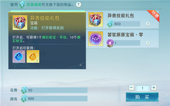 消耗御石秘宝进行探灵可获得技能石,提升技能等级。御石秘宝可以从商城用绑定元宝购买,或者从珍兽魂魄商店兑换,个人推荐使用珍兽魂魄兑换异兽技能礼包。