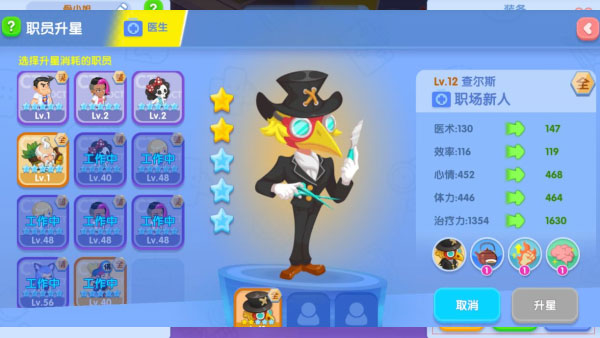 通过医治病人和完成日常订单等任务获取职员经验值对职员进行升级,职员等级达到一定级别的时候可以通过职员证书晋升职员。