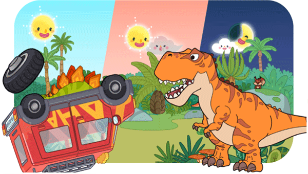 在雨林、海洋和城市中继续冒险。拿起你找到的每件物品并与之互动。首先将恐龙送到城镇,或者点击太阳来控制天气!