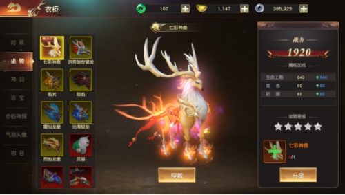 角色等级达到13级即可开启坐骑系统,坐骑作为游戏中的骑乘工具,带领少主们驰骋沙场,斩兵杀将 ;在坐骑系统中,进阶坐骑后能大幅提升角色属性,在坐骑星级达到五颗星后,更可获得炫酷外观。