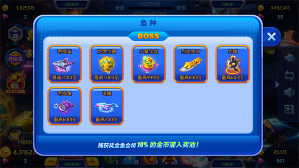 5.加入各种技能:锁定,冰冻,狂暴,核弹,大鱼Boss轻松捕获,更有Boss召唤卡,再也不用苦苦等待Boss。