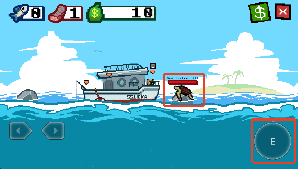 2、使用右下角的按键来控制鱼钩的方向。用鱼钩撞击一条鱼,对它造成伤害,伤害足够后将它钓上来。