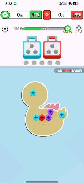 我要解螺丝赚钱版是一款结合了休闲玩法与奖励机制的游戏,玩家需通过触摸屏幕控制螺丝刀,将不同颜色的螺丝从界面中移除并放入对应的盒子内完成关卡任务,通过闯关有几率获取红包,感兴趣的玩家不妨下载一个。