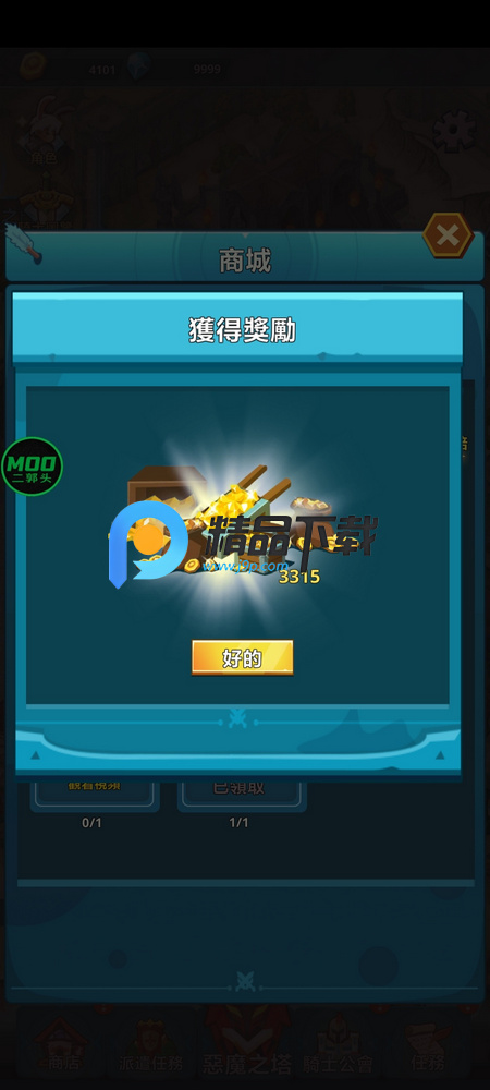 打个几轮到达10层把自动战斗跟2倍速解开就行,有一点钱回来去训练升级骑士,之后把任务做完领下成就奖励,基本也差不多有10钻石了,10钻石可以去商店兑换5W金币,有了这5W金币很简单就能通过20层了。