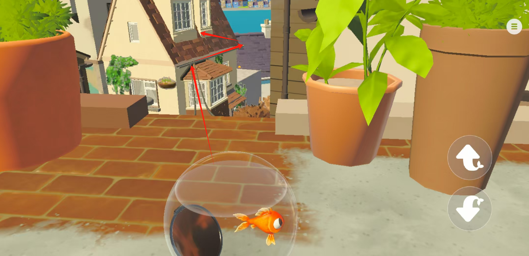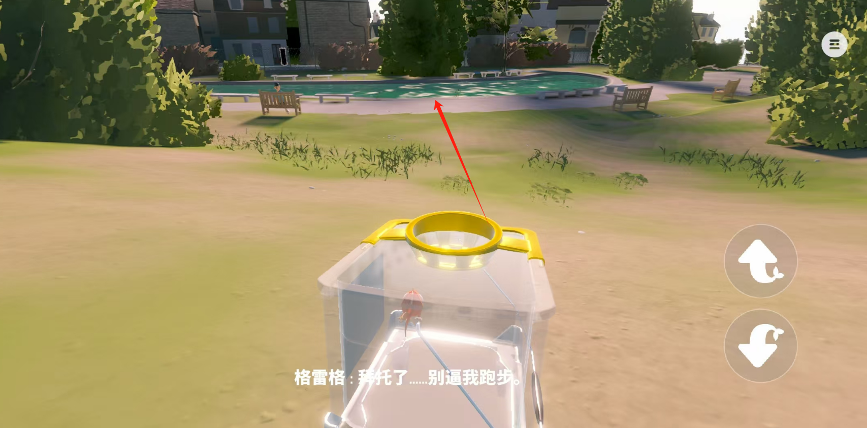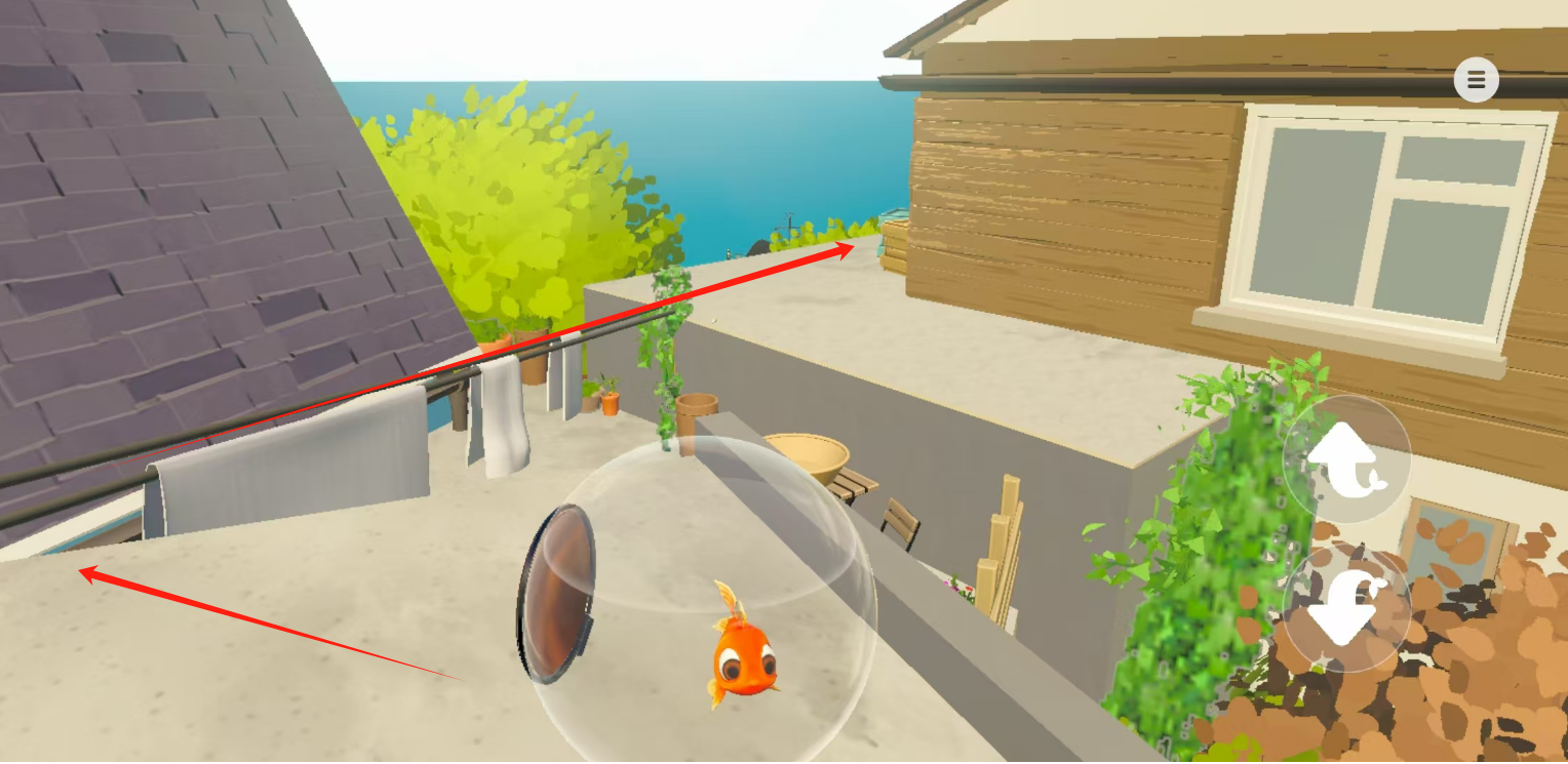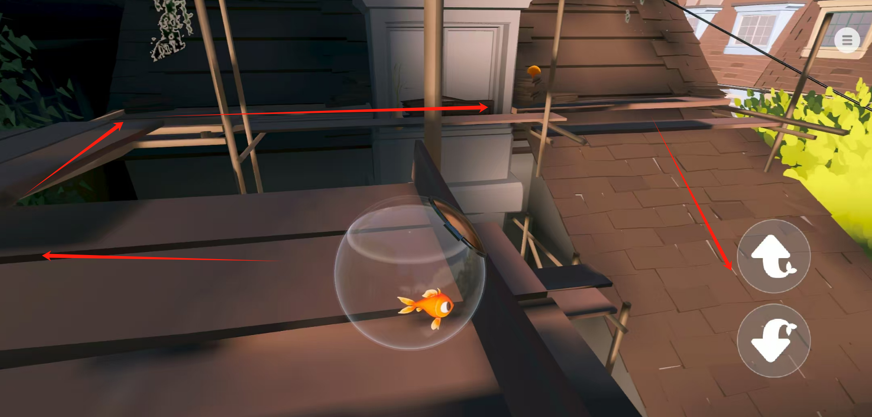 跟随红色箭头掉落到花丛上(否则鱼缸破碎死);然后那个缺口跳下去即可