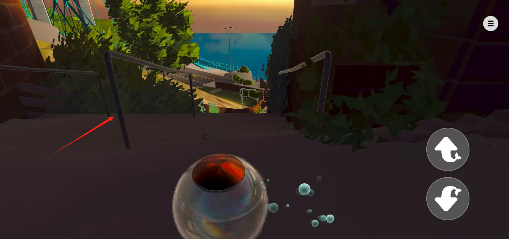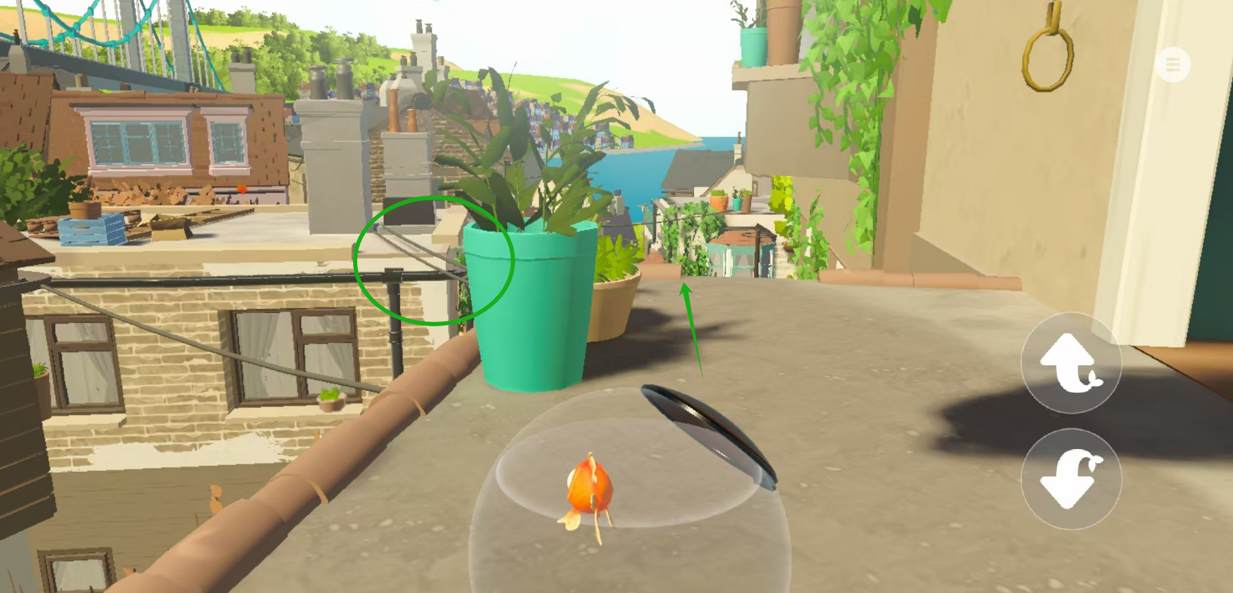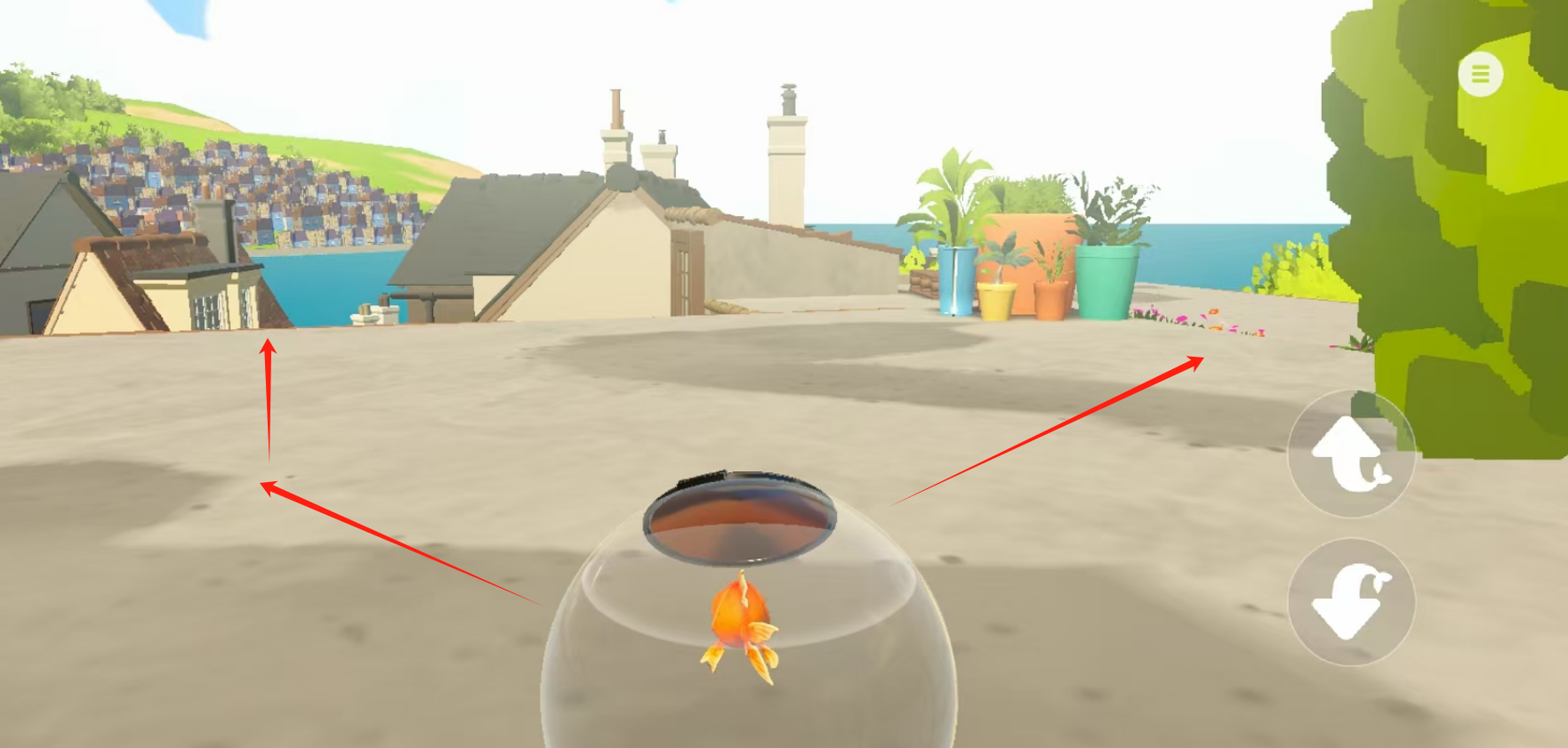 跟随红色箭头掉落到花丛上(否则鱼缸破碎死);然后那个缺口跳下去即可