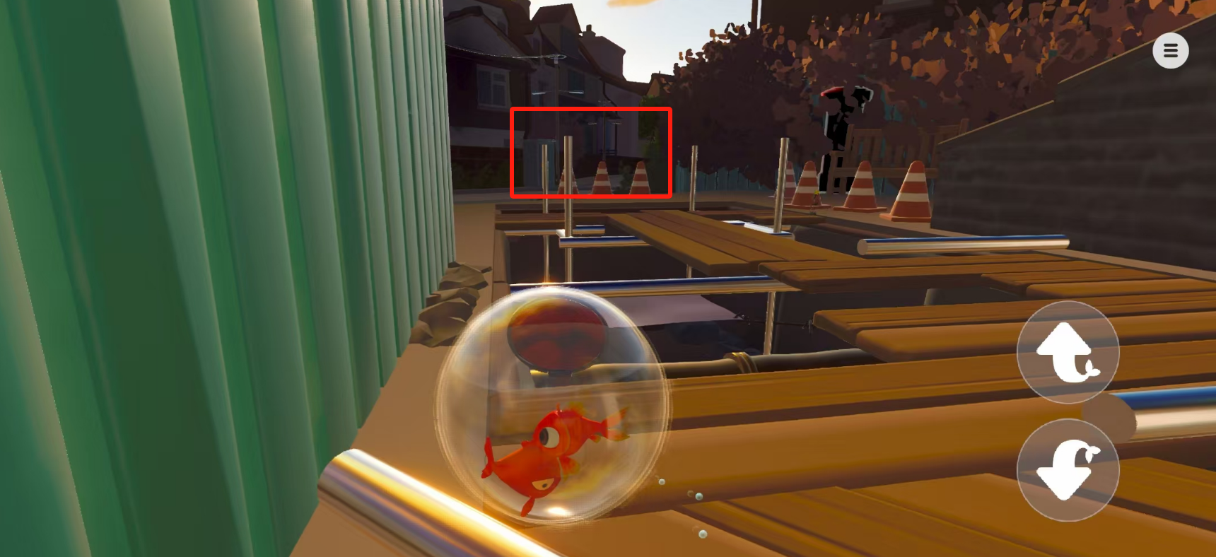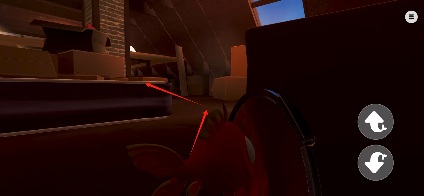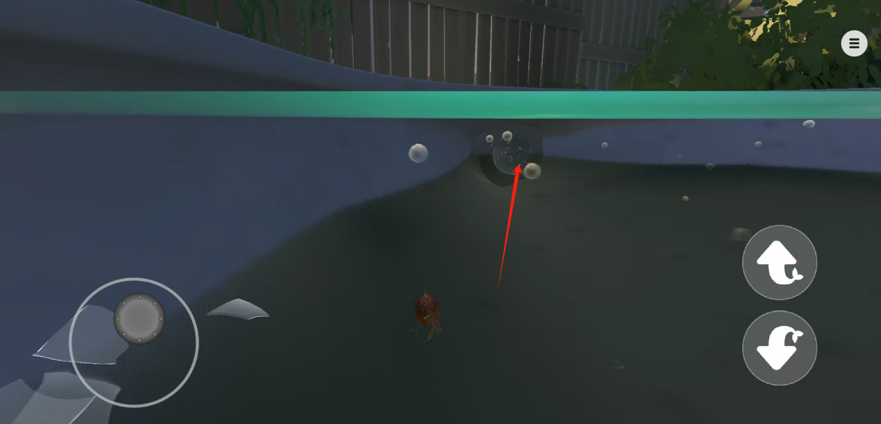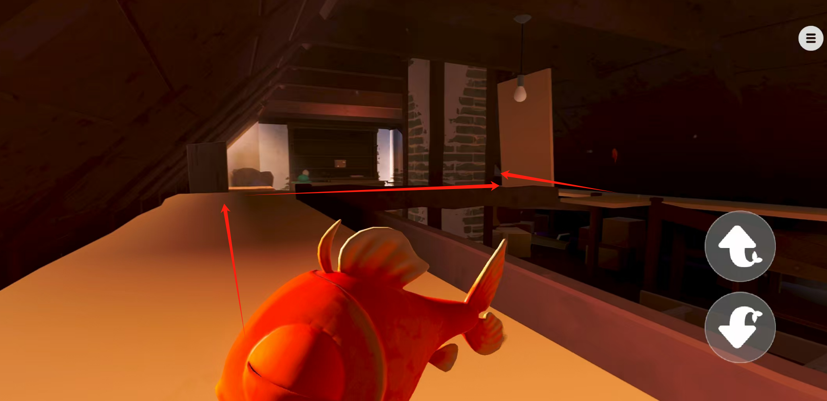 跟随红色箭头掉落到花丛上(否则鱼缸破碎死);然后那个缺口跳下去即可