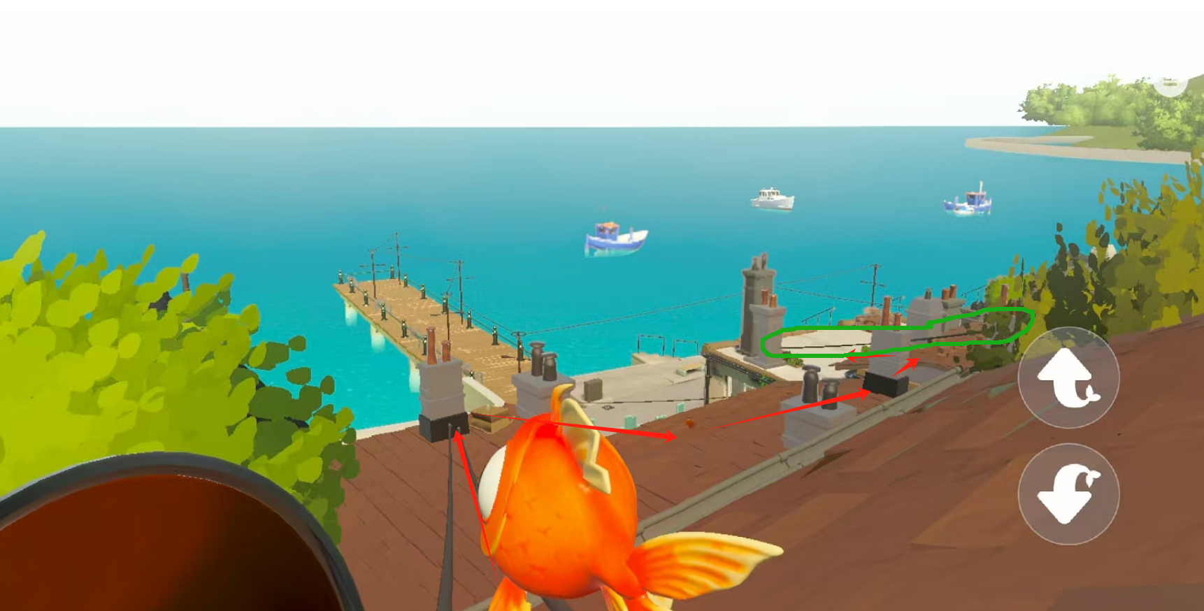 其次注意,往钓鱼佬那游,注意鱼线的颜色为金色(图没截到)