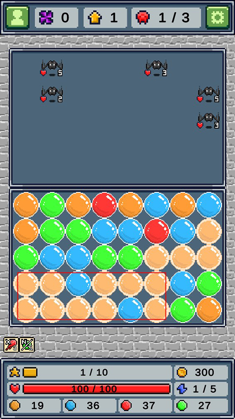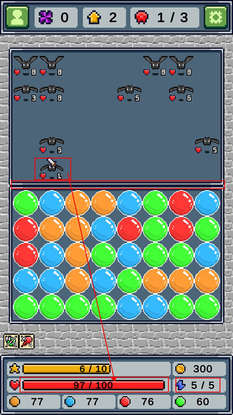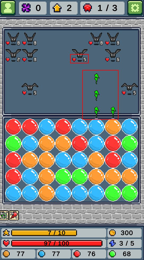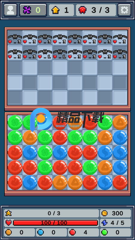 4.玩家在消除的过程中需要注意体力消耗,体力消耗完毕就会进入地方回合,怪物会往前走一格,当怪物走过线时就会攻击我方,扣除血量,当血量被扣完就会失败,需要重新开始。