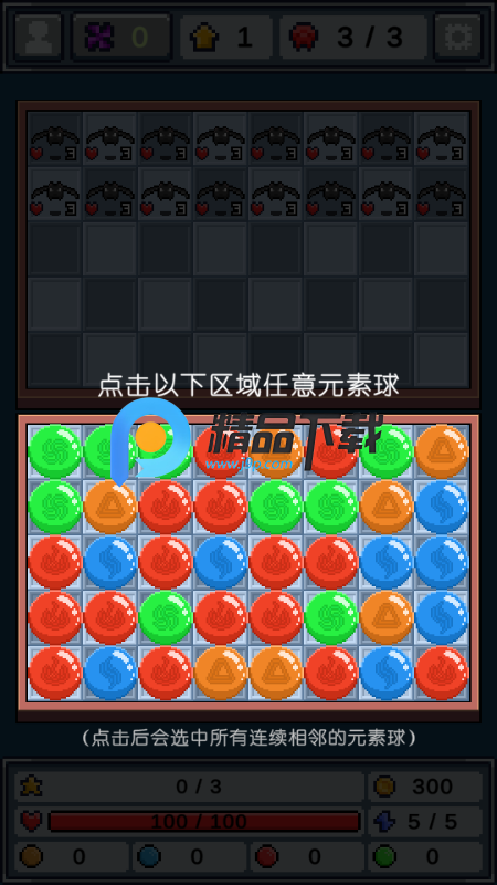 1.消除元素,通过双击元素球,就可以将连在一起的相同元素球消除,消除越多,造成的攻击就越多。