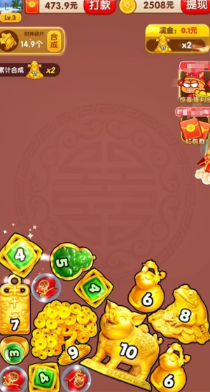 1、合成闯关机制:玩家需通过滑动或点击屏幕,将相同等级的物品(如黄金制品、数字方块等)进行合成,逐步升级至更高级别。