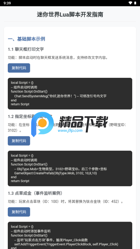 迷你世界脚本指南app是一款专为迷你世界游戏开发者设计的实用工具。它提供了丰富的基础脚本示例,这些示例可以直接复制使用,帮助开发者快速上手。此外,该应用还详细讲解了游戏机制,列出了常用事件和接口,全面覆盖了核心开发内容。