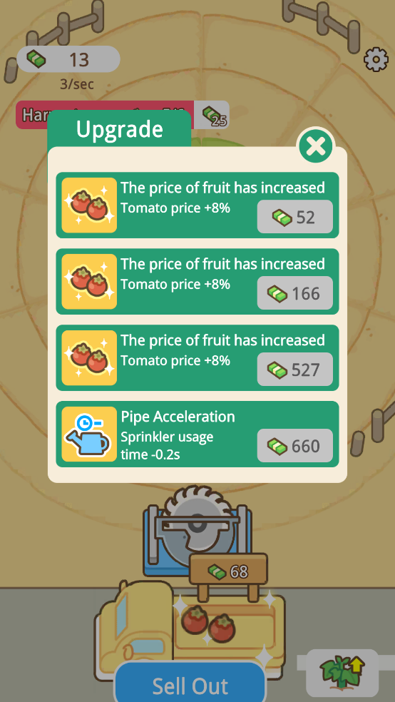 4、通过采摘成熟作物并出售,玩家可以获得金币。金币是游戏中的主要货币,用于购买升级和解锁新内容。