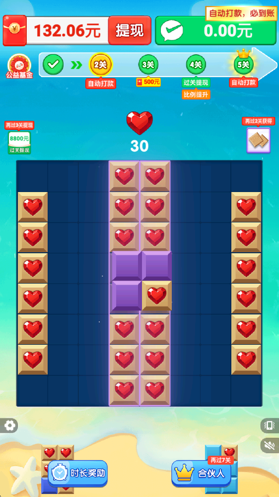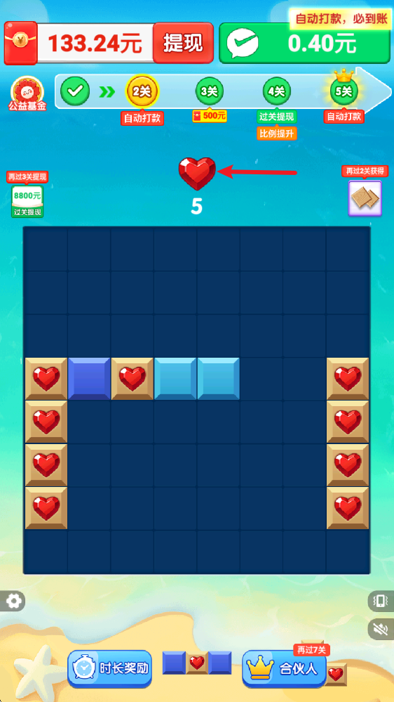 第一关的目标是消除280分,只需拖动两次方块即可通关,操作十分简单。完成后,系统会提示进入提现界面,此时账户显示余额为0.4元。