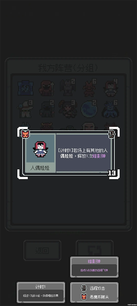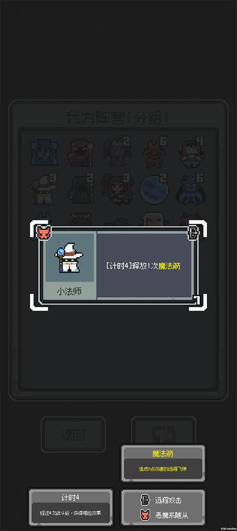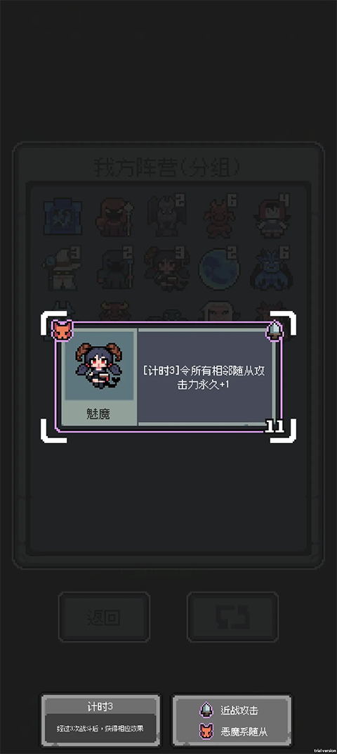 魔王终局是一款充满策略与趣味的类自走棋休闲游戏。在游戏中,玩家将扮演邪恶的魔王,面对不断涌入的冒险者,你需要运用智慧和策略,招募强大的随从,搭配合理的阵营,将冒险者赶出魔王城堡。游戏目前有120种随从可供选择,每种随从都有独特的技能和属性。