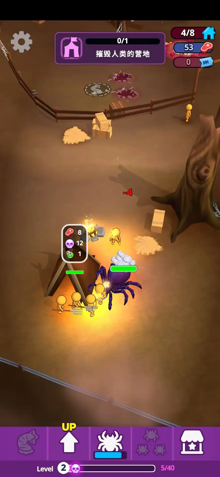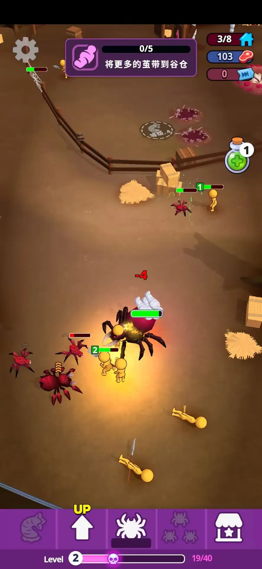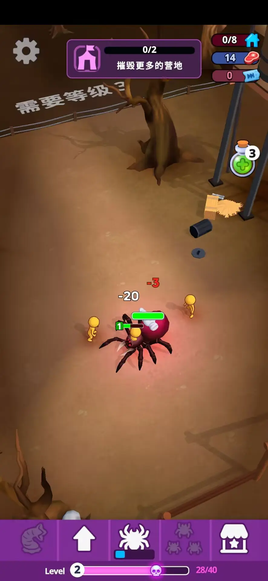 1、游戏中,我们通过拖动屏幕来控制蜘蛛进行移动,靠近人类后就会进行攻击。