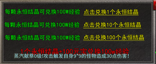 打装备回收元宝非常好打,全区全图大量实物狂暴,也可通过实物兑换处,用永恒结晶兑换经验。